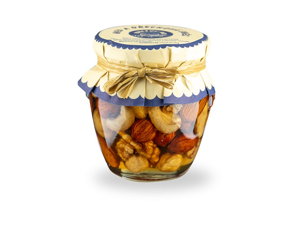 Vychutnejte si lískové oříšky, jádra vlašských ořechů, mandle a kešu v elegantním hávu akátového medu ⭐Med a ořechová směs 230 g.
