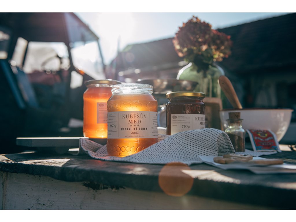 Ochutnejte Kubešův lahodný med rozkvetlá louka. Nektar z květů pampelišky, dymnivky, vrby a ovocných stromů sbíraný včelami z Jeseníku. Sklenice 750 g ⭐