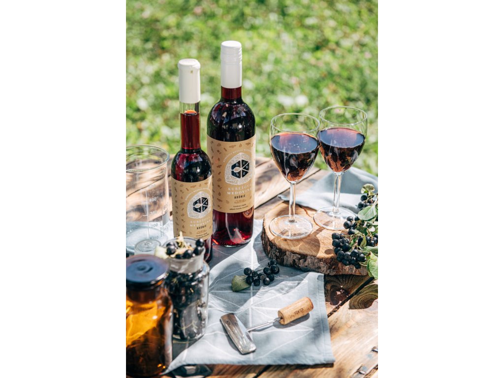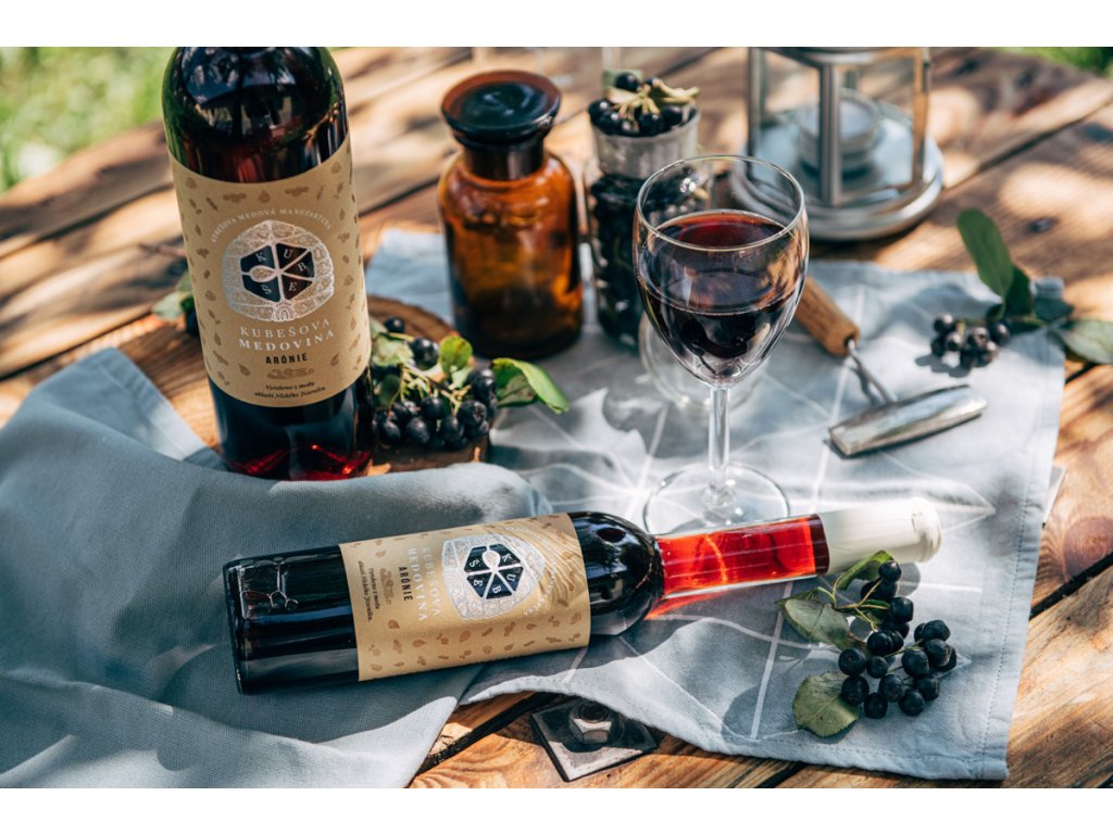 Ochutnejte Kubešovu medovinu ⭐ Medovina Aronie, tmavé barvy s fialovými odlesky. Ucítíte aróniový likér a ibiškový květ. Chuť bobulového ovoce. Láhev 0,35 l ✅