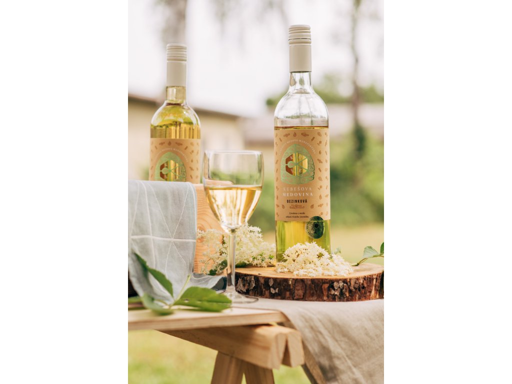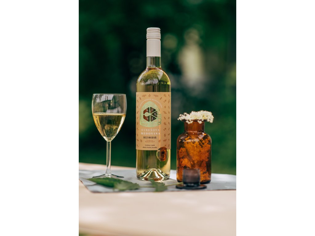 Ochutnejte Kubešovu medovinu ⭐ Medovina bezinková, sytě slámové barvy. Vůně a chuť květů černého bezu. Dochuť středně plná, příjemně osvěžující. Láhev 0,75 l ✅
